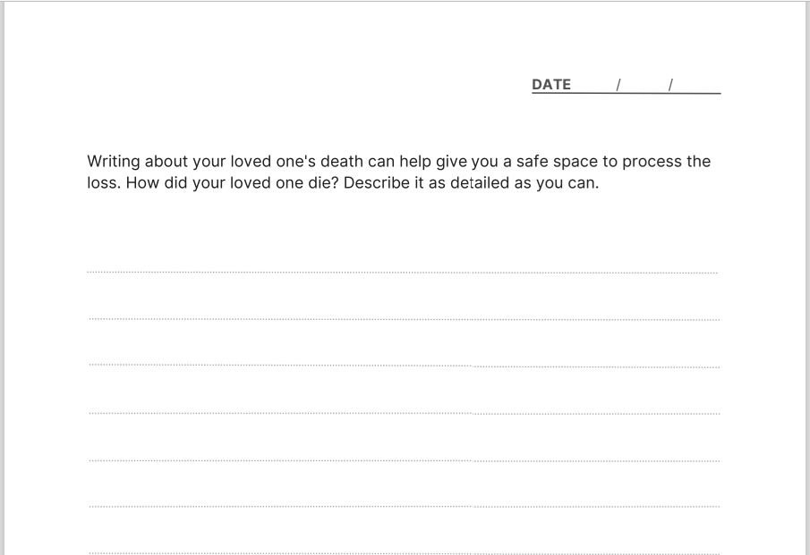 The grief journal comes with insightful prompts to help users put into words how they feel, as well as their stories, experiences, and narratives. These prompts give structure and direction to your journaling.